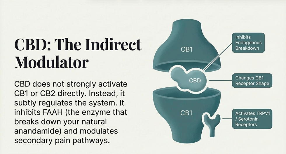 CBD works more indirectly. It inhibits the enzyme FAAH, which breaks down anandamide (from above). When FAAH is inhibited, your own natural endocannabinoid levels increase. CBD also modulates serotonin receptors, TRPV1 pain receptors, and inflammatory pathways independent of CB1 and CB2. The type of things pharmaceuticals tend to act on.